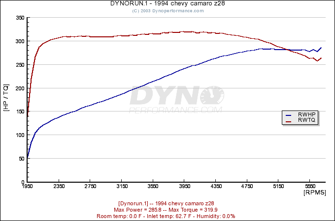 The Z28 saw the dyno on April 5, 2003, thanks to the guys at The Dyno Shop located in Santee, California. DYNORUN Summary: